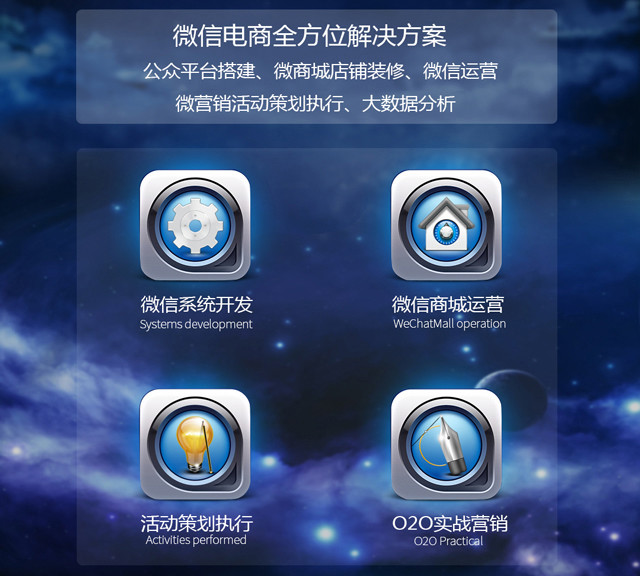 西北地区认证代理商,专注移动互联网营销,基于微信为企业提供技术开发、推广运营、一体化落地营销解决方案。承接微信第三方技术开发,任务宝、积分宝,投票,微信淘宝客及人人分销系统等营销插件,欢迎咨询!