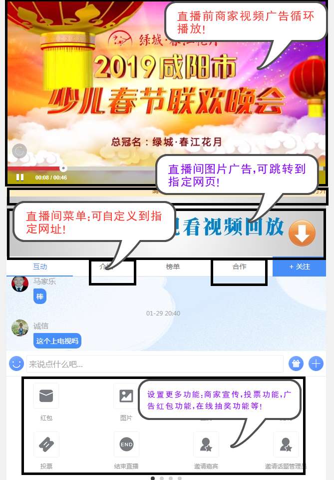 3、互动性强:可以在直播间发布留言、照片、红包、打赏、免费刷礼物等多种互动方式,提升直播间人气。