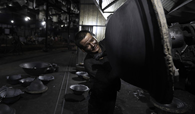 梁兴春家世代都是铁匠,他从父辈继承这门手艺,至今已过30年。叮叮咚咚的打铁声,梁家人用汗水打造着,铸铁锅中的国货当担。
