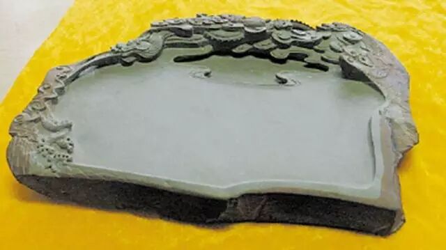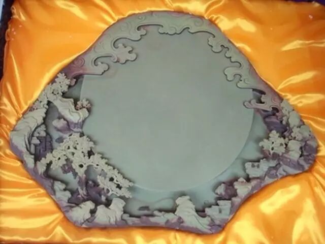 端砚产于广东肇庆市的端溪,已有近1300年的历史。端砚之石是3—4亿年前泥盆纪地质时期,经过高温高压后形成的泥质变质岩。它含软的泥和硬的硅,砚石刚中带柔。端砚石品常见的有鱼脑冻、荡青花、蕉叶白、天青、翡翠、金星点、水纹、金钱线和石眼等等。端砚的制作十分辛苦,从探察、开凿、运输、选材、整璞、雕刻、打磨、洗涤到装盒,其工序精巧又细致。